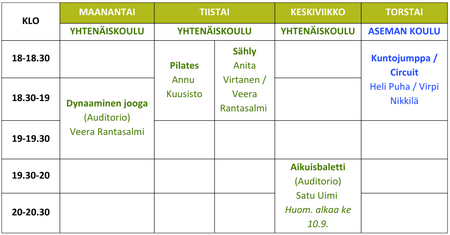 Tarjontamme löydät viereisestä lukkarista. Tunneille ei tarvitse ilmoittautua. Jokainen tunti kestää aina 55 min. Osallistuminen tunnille kirjataan paikan päällä olevaan vihkoon. Katso tarkemmat kuvaukset tunneista Tuntikuvaukset-sivulta.